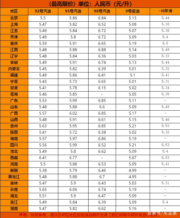 上圖是為大家整理的全國成品油最高限價(jià)一覽表,僅供參考。部分地區(qū)油價(jià):